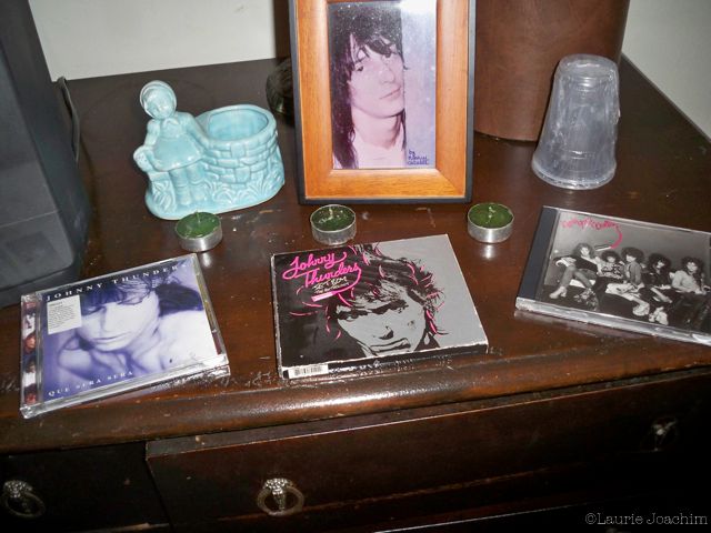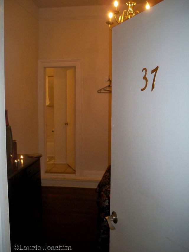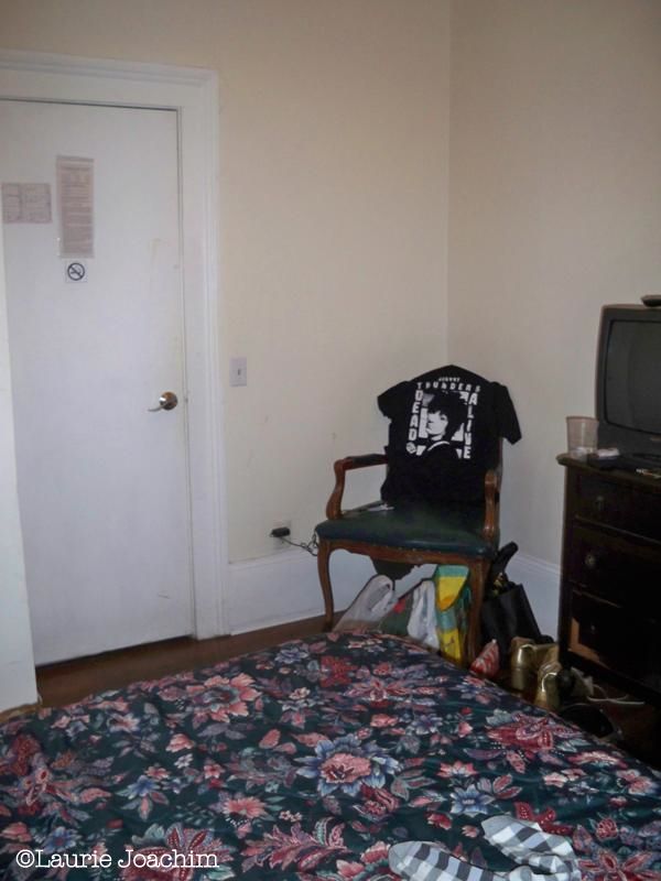 I brought some Johnny artifacts: some photos, some CDs. I played Johnny and the Dolls in the room constantly. When I had my alone time, I lit candles and said prayers. At first I felt really sad and tormented. Room 37 was not a happy place for Johnny Thunders. He died there, miserable and scared and alone. I didn’t want to have that heavy energy of sorrow. So I sent out good thoughts to the spirit of Johnny, and then I did what any New York Dolls fan would do: I danced. I danced like a maniac all over the room and on the bed and even in the bathroom. I danced to “Trash,” to “Pills,” to “Chinese Rocks,” To “Pirate Love.” I even danced to “You Can’t Put Your Arms Around a Memory.” And I sang every word.