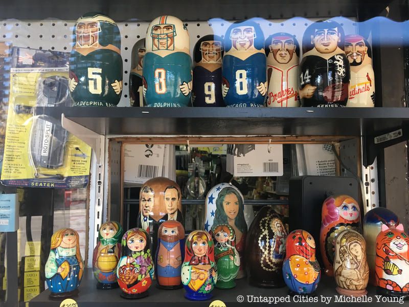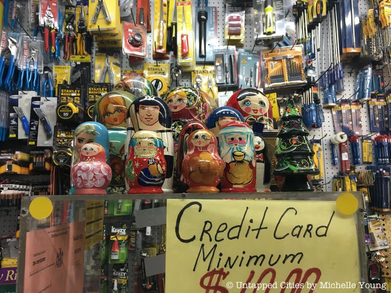 The owner, who hails from Russia, tells us he has been selling the Russian matryoshka dolls (also known as nesting dolls) in his hardware store for 21 years, 10 at this location. The odd combination stems from his previous job selling Russian dolls, which he simply carried over into the hardware business. The dolls, which are imported, are particularly popular around the holidays as gift items, as well as Russian icon pendants he sells next to the cash register. The dolls, which start at $10, come in a range of sizes from minuscule to larger ones, and some of the smaller ones are actually more expensive due the handiwork.
