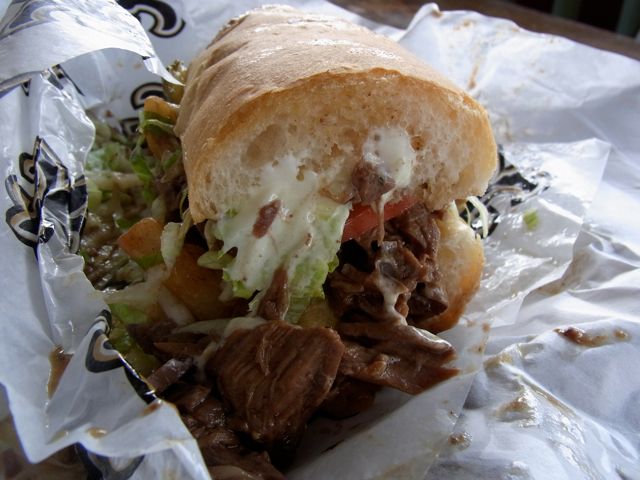 The gravy (optional for an extra dollar) soaks through the lower half of the French bread, and when you finish eating you may feel like you’ve just strangled a greasy dishrag. A delicious greasy dishrag. The French fries form one massive starchy conglomerate thanks to the gravy and the dressing. And while gravy may sound like a strange topping, it actually includes a significant amount of debris and might be more accurately described as roast beef.