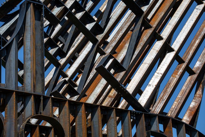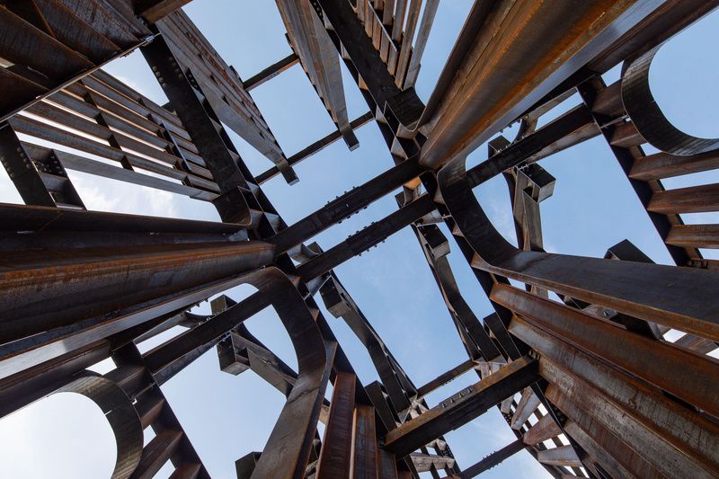 Galanin’s towering sculpture stands the same height as the border wall, with steel tubing that spells out the word “LAND” in the style of Robert Indiana’s 1966 sculpture, LOVE. The artist often borrows elements from Pop Art and minimalism to exemplify mass media and pop culture. The letters are comprised of four layers of metal bars that create a shape-shifting effect as you view the sculpture from different angles. The text is legible one moment and abstract in the next. This ambiguity “illuminates the lack of borders and division in Galanin’s Indigenous view of a united natural ecosystem and way of life, embracing peaceful movement from one place to another.”