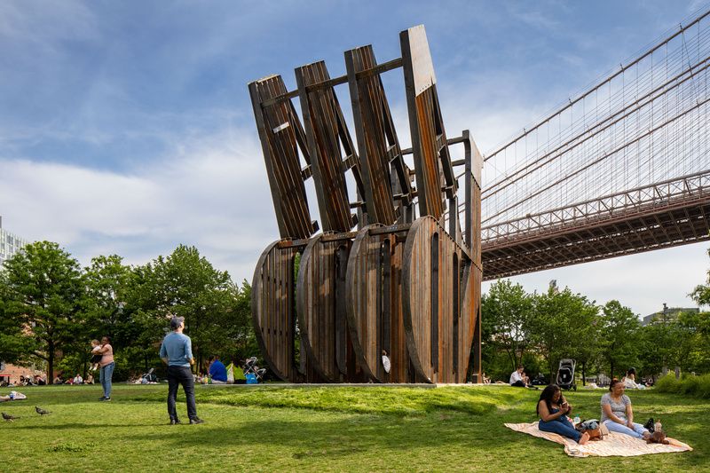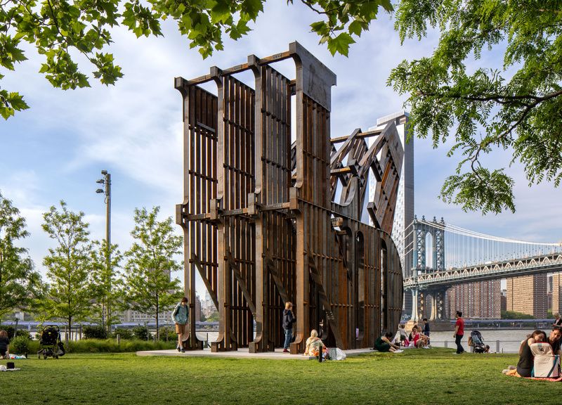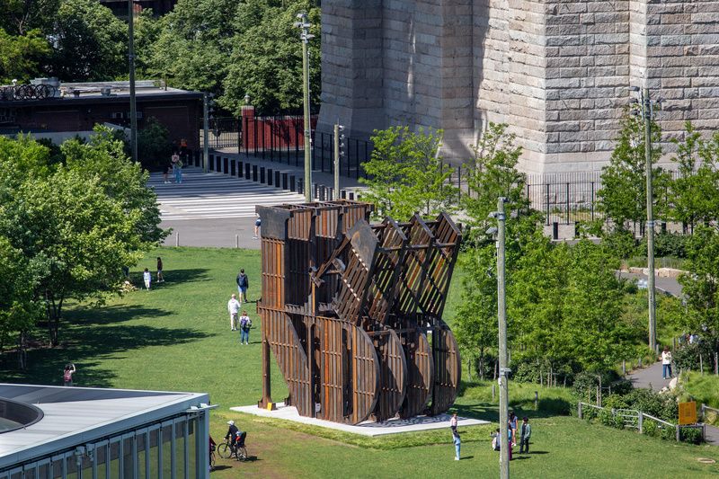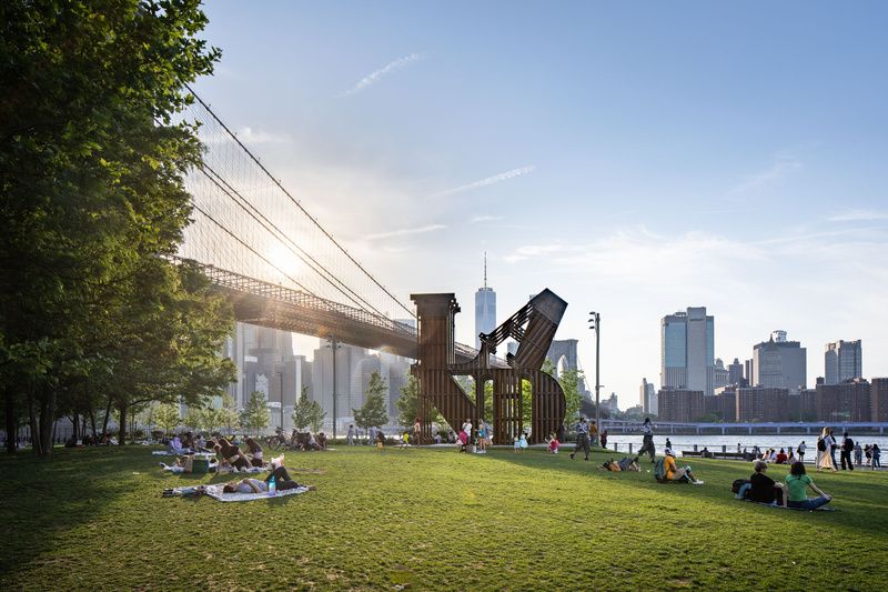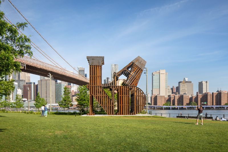 In his debut public art installation in New York City, artist Nicholas Galanin mixes Pop Art with politics. Crafted out of the same steel tubing used to build the U.S.-Mexico border wall, Galanin’s 30-foot-tall sculpture inspires viewers to contemplate colonization and our relationships with Land across generations, cultures, and communities. Titled In every language there is Land / En cada lengua hay una Tierra, the piece was unveiled in Brooklyn Bridge Park this week on the Empire Fulton Ferry Lawn.