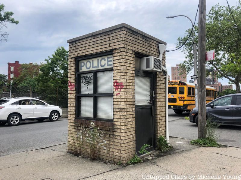 When he was a rookie assigned to this station, he says it was originally “built for an old-timer – Police Officer Danielski, this was his post.” In addition to the watch post, there were also House of Worship (HOW) patrol cars that would monitor activity in front of synagogues. Despite some aging, a little graffiti, and some weeds, the station is fairly intact on the exterior. The POLICE sign in a blue Helvetica-style font is on three sides of the building. There’s a door with a numeric keypad on the side facing Keap Street with an air conditioning unit on top. Blinds are drawn on all sides but on the side facing Williamsburg Street East and the BQE, two top windows were tilted open. It is still used by the Hasidic community, as we saw lights on inside on a Friday night.