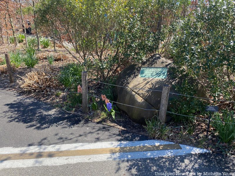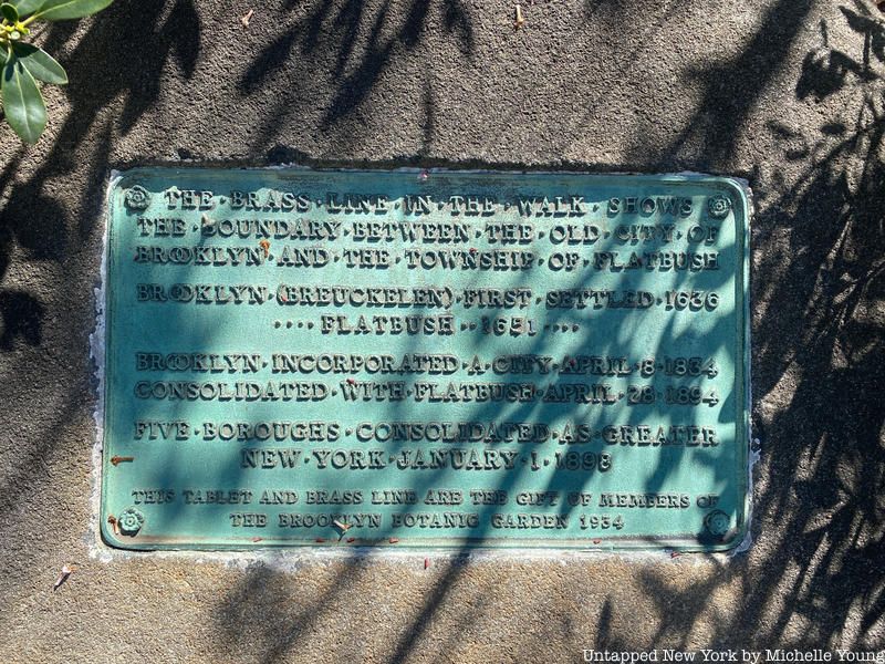 Tucked inside the Brooklyn Botanic Garden’s Flatbush Avenue entrance is a bronze patent line embedded into the asphalt that extends across the walkway. Few visitors will know that it denotes the former geographical boundary between Brooklyn and Flatbush. At one end of the line, a stone marker has a small bronze plaque that reads: