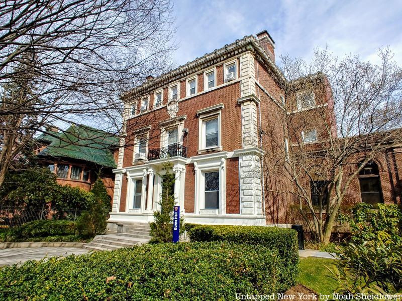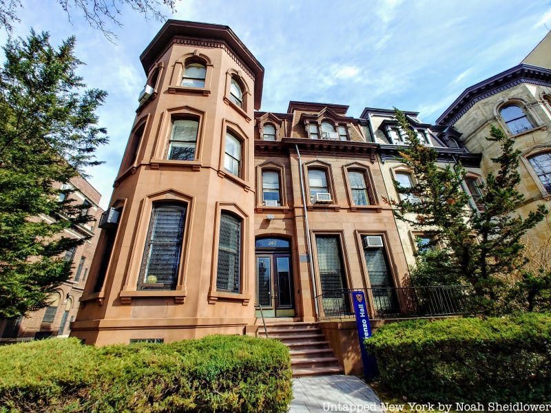 70 Lefferts Place, hidden behind a gate and large foliage, is an Italiante-style home also named for James W. and Lucy S. Elwell. James William Elwell was a longtime Brooklyn shipping merchant and member of the New York Chamber of Commerce who owned shipping firm James W. Elwell & Co. Elwell was also a philanthropist who donated over $3 million to institutions including the Graham Institute and Brooklyn Orphan Asylum. The home was built around 1854 alongside a flower conservatory, and it remained in the familyâs hands until it was purchased by the Father Divine Church in 1939. The yellow home was put on the NRHP in 1986.