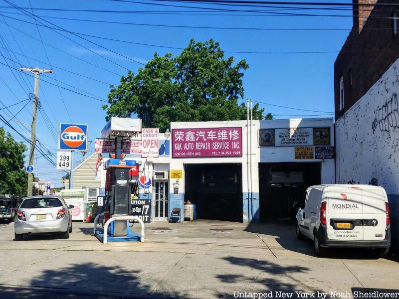 Farrington’s Service Station appeared to be an unassuming gas station on 15th Avenue, but it was actually New York’s oldest Gulf gas station and likely the oldest gas station in Queens. Today, it remains a Gulf station, though a new company called K&K Auto Repair Service has taken over the space. Farrington’s opened in 1868, nearly two decades before the first car was manufactured. It was owned by the same family since its opening, started by William Farrington as a blacksmith shop for horseshoes and horse feed; the family dates back to the 17th century when New York was New Netherland.