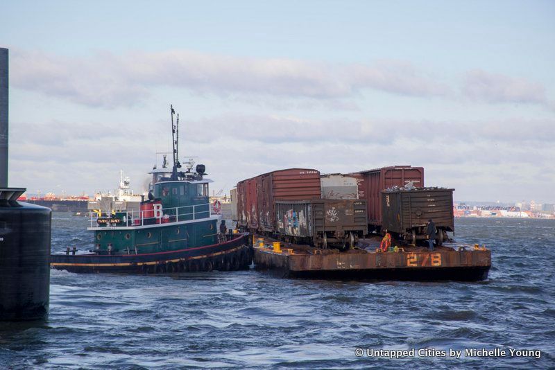 While walking around Industry City, you may see some railroad tracks in the road, and occasionally a train coming through to Brooklyn Army Terminal. At the 65th Street Rail Yard resides one of New York City’s infrastructure survivors—a floating barge freight train line operated by the Port Authority that runs from to the Greenville Yard in Jersey City across the Hudson River. Though the line is only four miles long, it serves as a critical link for freight transportation in the New York region and cements the city’s commitment to bringing industry back to the waterfront. Taking just 35 to 40 minutes to cross the Hudson River, the floats help to take trucks off the highway and give freight a more direct route between New York and New Jersey.