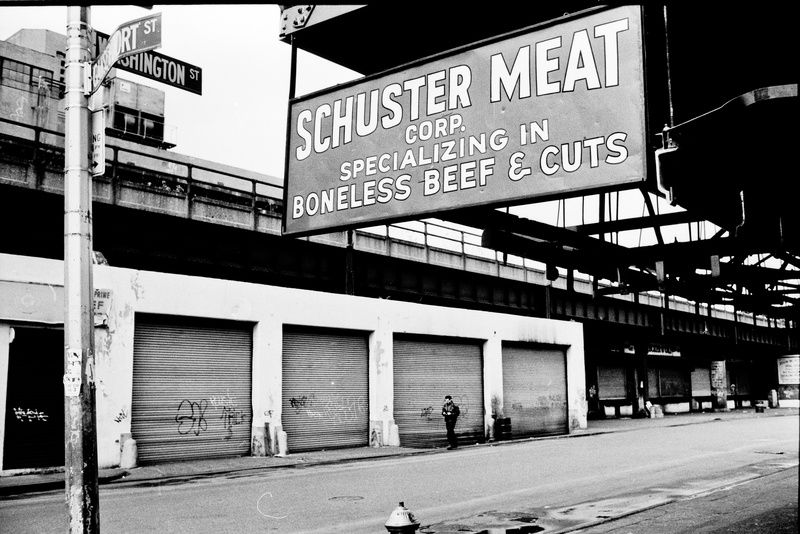 Amidst the meatpacking business’ downturn in New York, this shot captured by Rothstein in 1988 shows the Meatpacking District before the Whitney Museum of Art and the many high-end boutiques began invading the neighborhood. Beginning in the 1960s, many meatpacking businesses began to change as a result of the new supermarket culture which characterized the mid-sixties. As a result, in the 1970s, many of these abandoned meatpacking buildings became gay bars and nightclubs, changing the atmosphere of the neighborhood entirely. In the late 1990s, many of these clubs moved and high-end shopping boutiques opened up, thereby changing the atmosphere of the Meatpacking District again.
