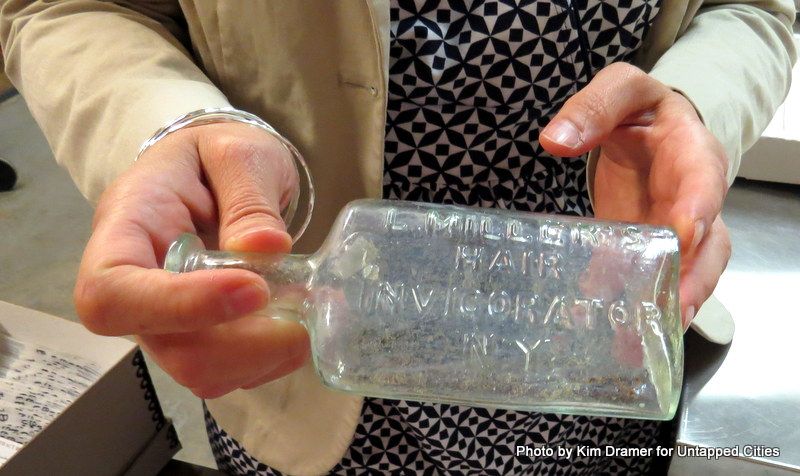 Speaking of New York City women of the 19th century, Ms. Sutphin pointed to three different bottles designed to hold manufactured goods. These artifacts signaled that like today, New York women of the past were responsible for the majority of purchases in the city’s households–thus a driving economic force in the city. A variety of 19th century bottles were excavated from root cellars in Van Cortlandt Park in the Bronx when it morphed from a private home to a public park.