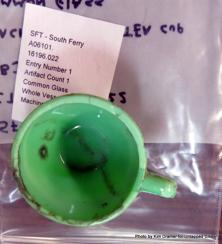 At the southern tip of Manhattan, the renovation of the Battery Park subway tunnel yielded a mid-20th century toy belonging to a New York child. A play teacup made of Depression-era glass was likely lost by a little girl playing in what was then a park.