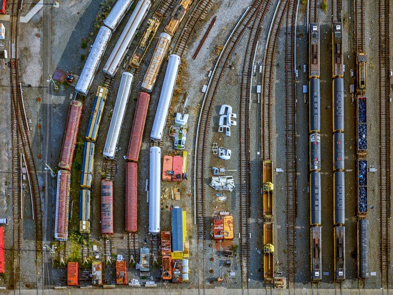 Milstein’s bird’s eye shots are described as geometric mosaics: the images feature ordered patterns, which are organically created from arrangements of ordinary city fixtures like shipping containers, train cards and automobiles.