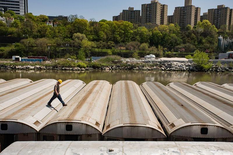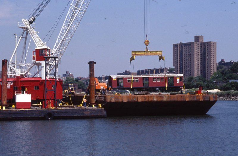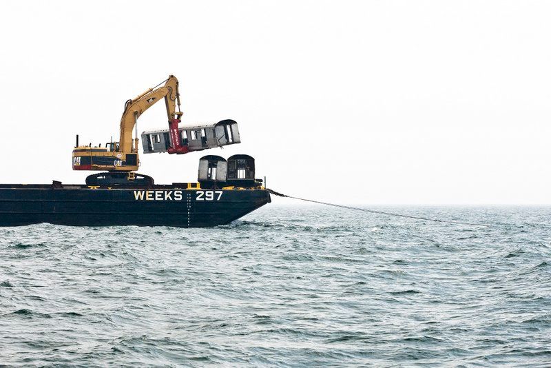 Artificial reefing, or underwater habitats formed around sunken manmade objects, is a long-time marine practice. The first planned artificial reefs were boats in the early nineteenth century. Throughout the twentieth century, objects like school buses, refrigerators, have all been transformed into reefs. In 2017, the New York City Department of Environmental Protection placed 5,000 crushed porcelain toilets from New York City school buildings into Jamaica Bay to build an oyster reef. All artificial reefs are created following strict protocols enforced by the U.S. Environmental Protection Agency. From the 207th Street Overhaul Shop, the subway car shells get barged from the Harlem River to their final resting places off the Atlantic coast.