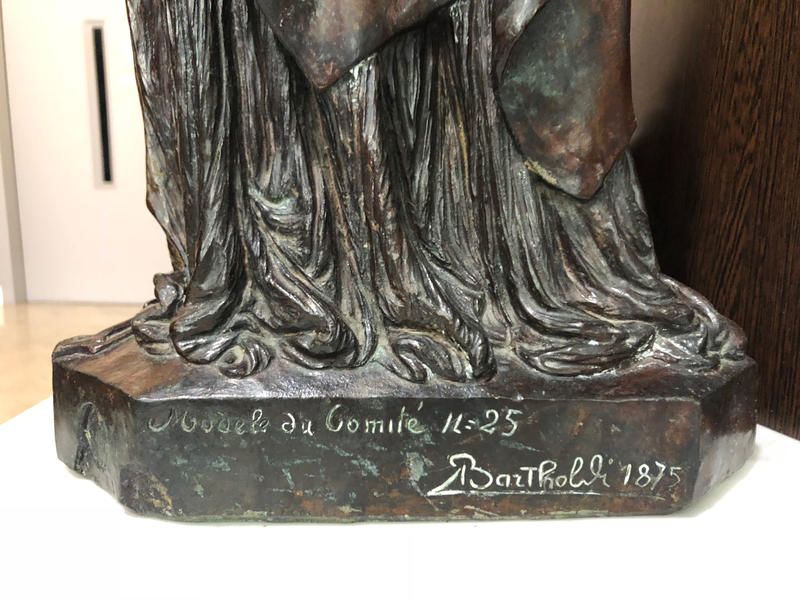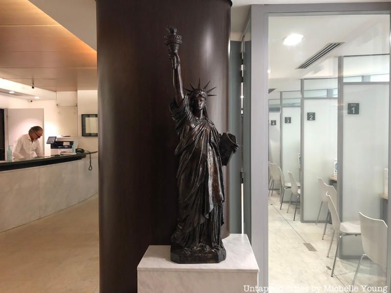 The logo of the medical clinic offers another clue: it has the head of Lady Liberty on it. And finally, for those that venture inside, the lobby has a real bronze model of the Statue of Liberty by Auguste Bartholdi. On the right side, you’ll see the year of the model, 1875, with the words “Modele du Comité.” An employee of the clinic who works at the main desk confirmed that it is indeed an authentic model and added that the studio was once on both sides of the street.