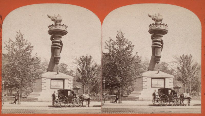The hand and torch of the Statue of Liberty on display in Madison Square Park. Photo via New York Public Library.