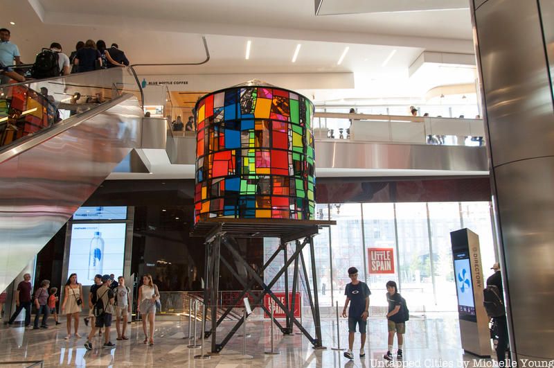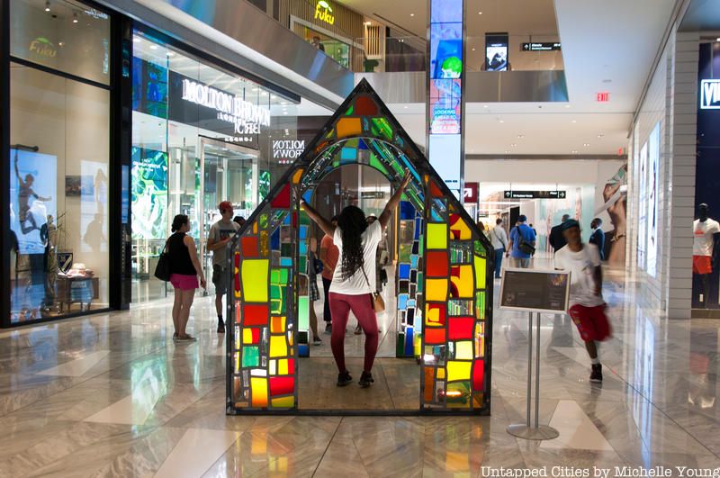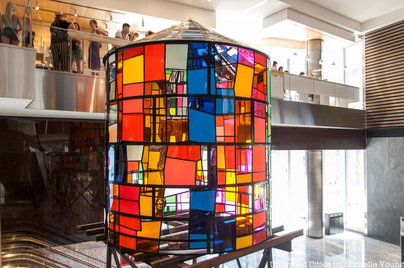 While you may have seen one of Tom Fruin’s mosaic glass water towers from afar – from the Brooklyn-Queens Expressway or from the street in Williamsburg – it is a rare treat to see one up close. Now, one of his water tower works is on display inside The Shops at Hudson Yards. This work, and an accompanying glass house from Fruin’s Kolonihavehus series, are an initiative of AVANT Gallery, located inside 30 Hudson Yards. An escalator goes by the water tower so you can get peer inside on the ride up or from the second floor balcony. Smaller original and scale models, even an adorable night light version of Kolonihavehus (which are inspired by the shape of a garden house), are available for purchase in the gallery.
