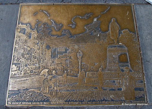 The statue of Abraham Lincoln by Henry Kirke Brown was dedicated in 1870 and moved to its present location in 1980. The statue is presently located on the north side of the park, just south of the pavilion: