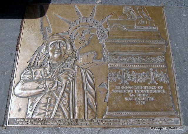 Bartholdi, sculptor of the Statue of Liberty, cast his Marquis de Lafayette statue in 1873. It was dedicated on July 4, 1876. Originally set facing the Washington statue, the work depicts Lafayette pledging his sword to the General. (The statue is currently located on the eastern side of the park near 15th Street):