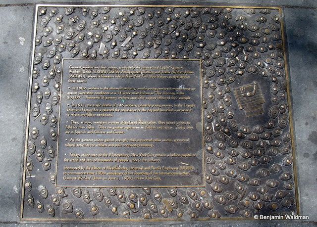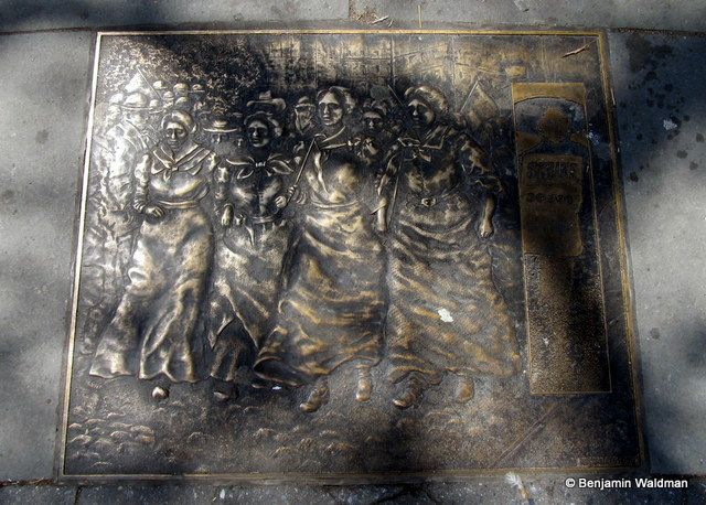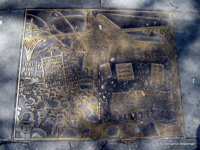 The second series of sequential art in Union Square can be found on the western side of the park hidden behind the park’s fountain. These plaques depict scenes from the history of the labor movement, including the Triangle Shirtwaist Fire: