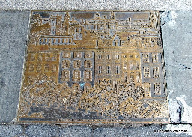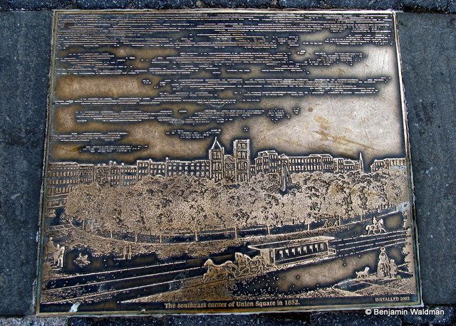 This is part two of a series on sequence art in New York City which previously covered the Commuter’s Lament in the Port Authority-Times Square tunnel and the Library Walk at Bryant Park. Union Square provides a unique lens through which to view the past 172 years—a series of plaques located around the perimeter of the park. There are two sets of sequential art: one depicting the history of the park and the other illustrating scenes from the labor movement. The plaques were sculpted in bronze by Gregg LeFevre and were dedicated in 2002.