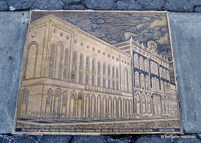 The Academy of Music, built in 1854, and the third Tammany Hall, 1868, on 14th Street east of Union Square (both buildings were demolished in the 1920s to make room for the Consolidated Edison Building):