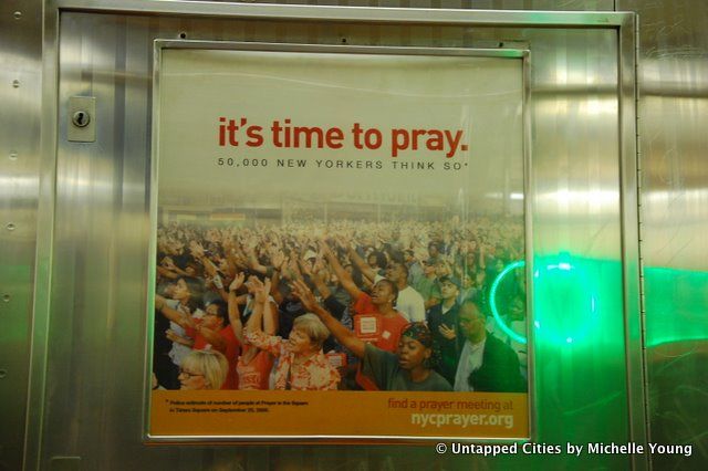 This tunnel (like the one between the S and the 4/5/6 in Grand Central) is usually peppered with extreme evangelical Christians. Today, there was a guy bemoaning of the evilness of Satan but he really did it with pizzazz: “I like your style,” he told a girl. She took the card he was handing out and said “You’re still creepy though.” A typical New York moment. And then I got to the 7 train and saw this poster. Europeans think our obsession with religion is weird–it’s probably partially because of what they come across in this highly trafficked transit station!