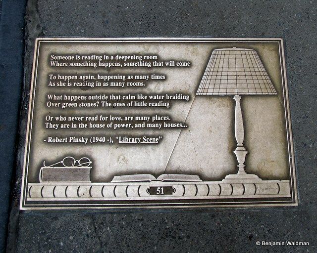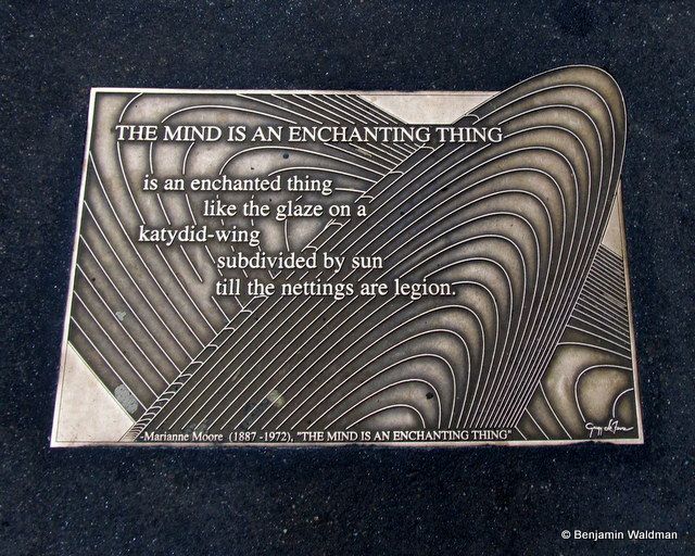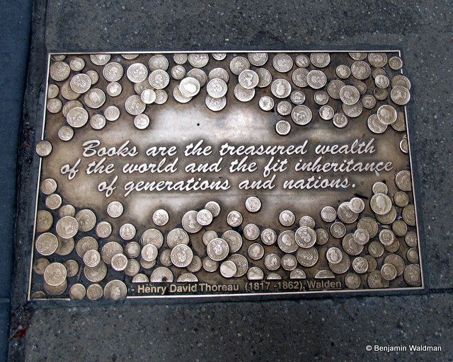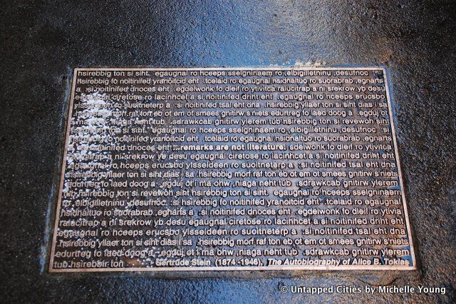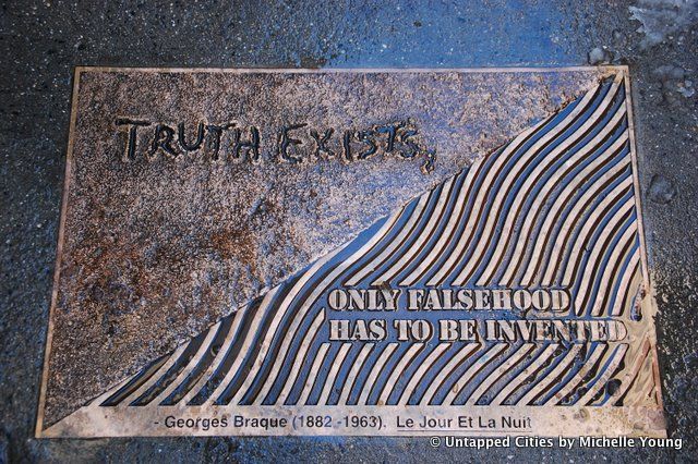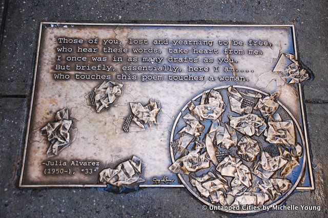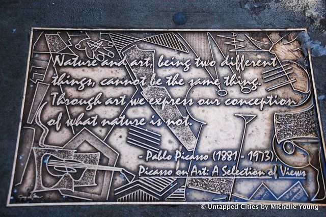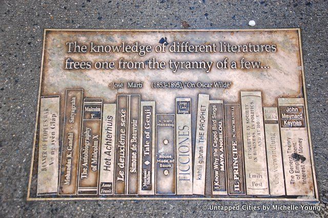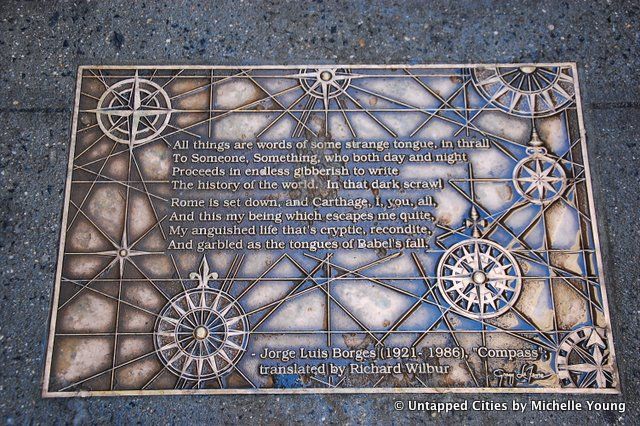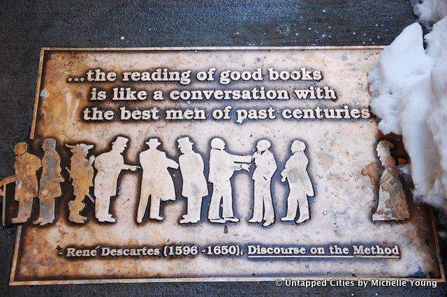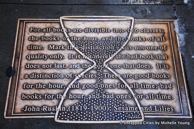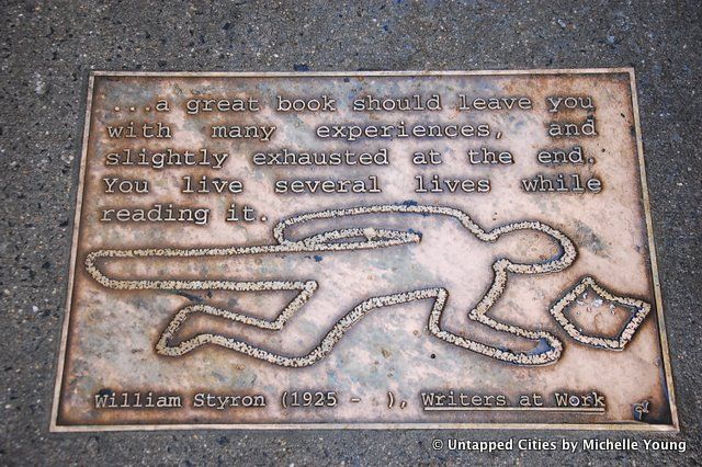 Another beloved sequence of mine is the “Library Walk” on 41st street between Madison and Park Avenue (near Bryant Park). It’s by sculptor Gregg Lefevre and is an ode to the great writers from antiquity to present. Many of the plaques appear more than once for some unknown reason. My favorite one is the one by Gertrude Stein that is backwards, with “this is not gibberish” in the top left hand corner. “The knowledge of different literatures frees one from the tyranny of the few,” reads another. It is also remarkable that many of the plaques break the fourth wall, extending onto the sidewalk.