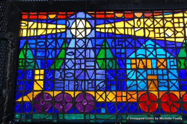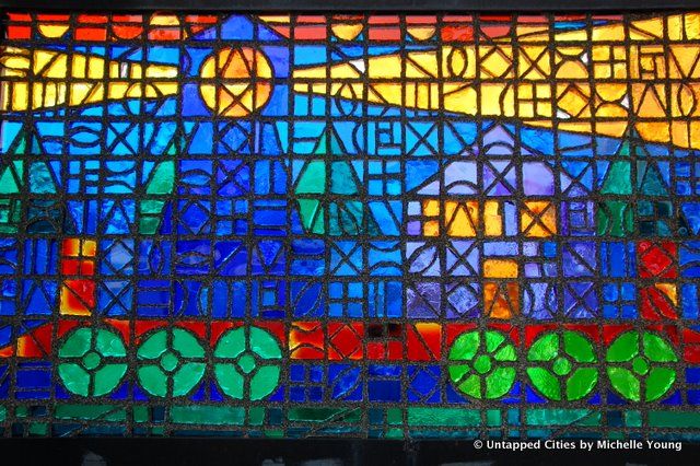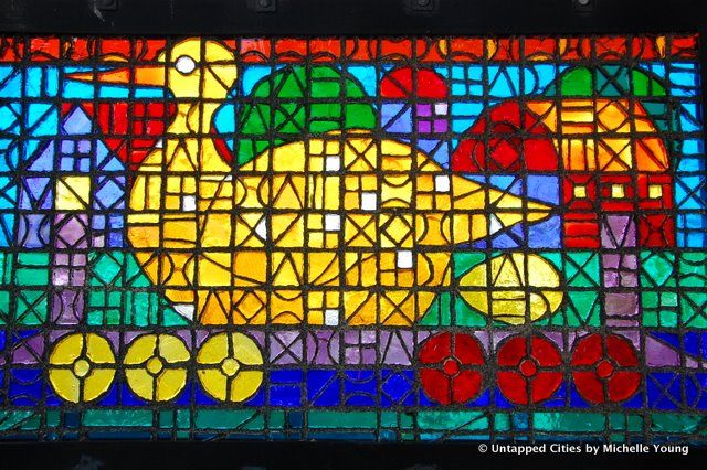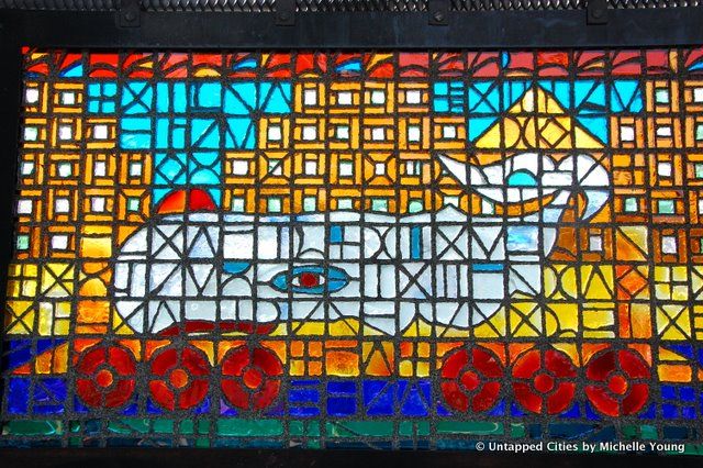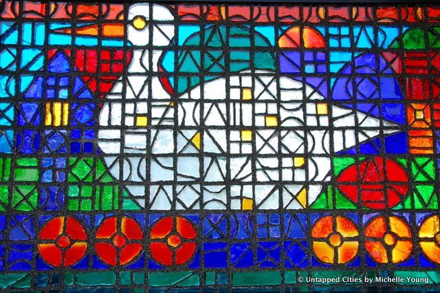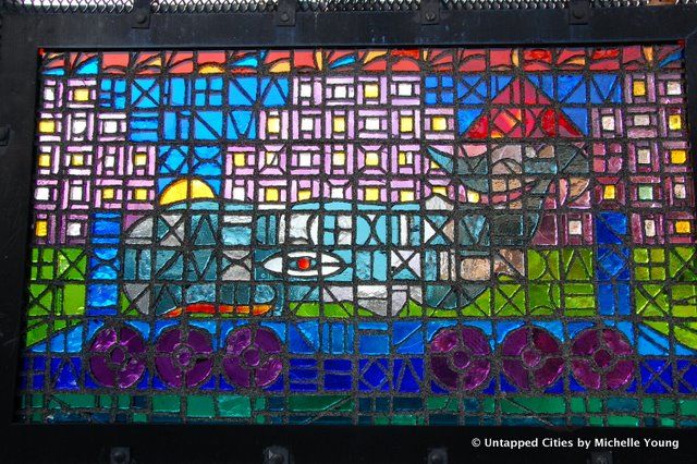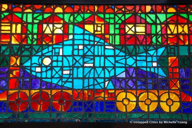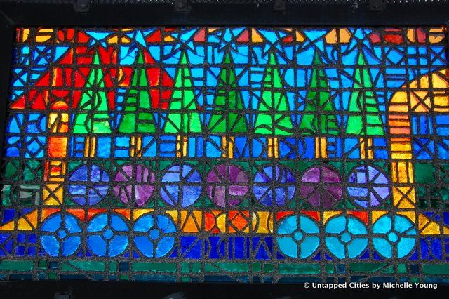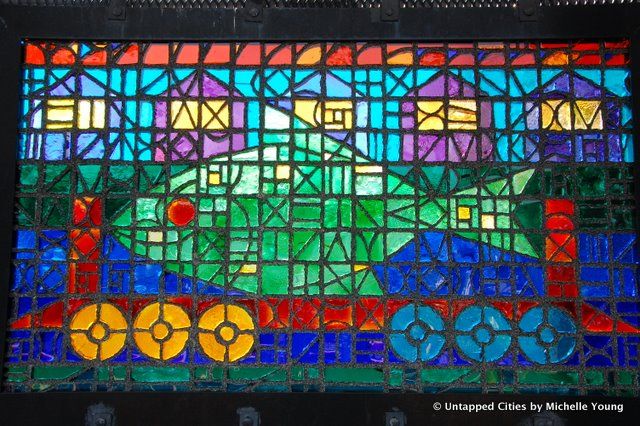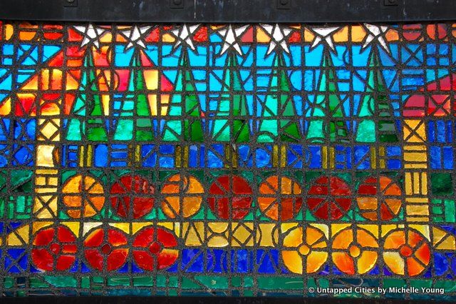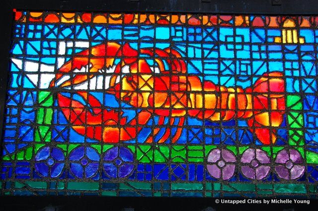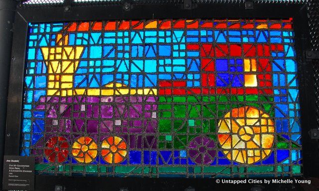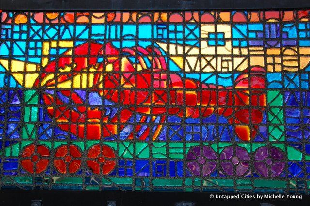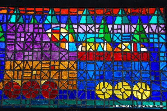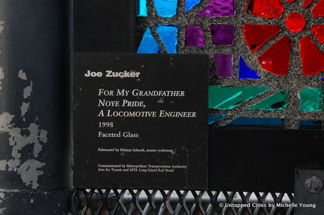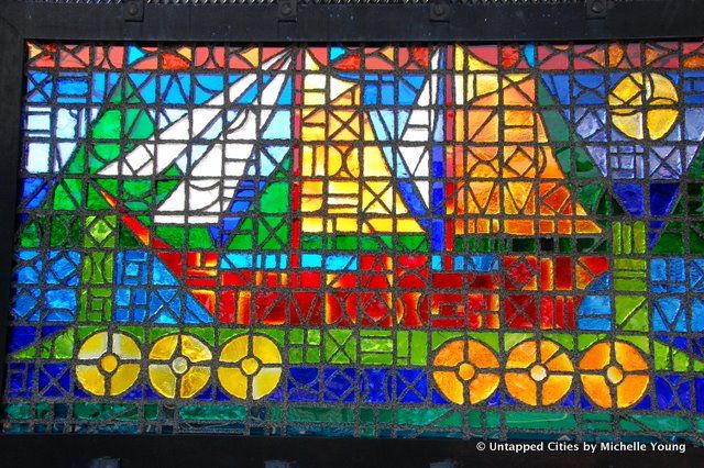 The 130-foot sequence of glass panels at the Huntington Long Island Railroad station by Joe Zucker does exactly what it was intended: to evoke a nostalgia for Long Island as you pass through this oft-traversed transfer station between New York City and the terminus of the Port Jefferson line. Zucker says, “I hope that this piece brings travelers enjoyment, that it gives them memories of Long Island and moments of pleasure.” The images that artist Joe Zucker depicts are familiar sights–the Long Island Duck, the Montauk lighthouse–each atop a train flatbed. It is also a celebration of Long Island’s trade and agriculture–in addition to lobsters, there are oversized fish and giant potatoes (with “eyes”) in whimsical colors. Entitled For My Grandfather Noye Pride, a Locomotive Engineer, it was part of the MTA Arts for Transit Program.
