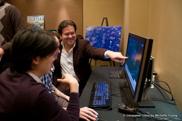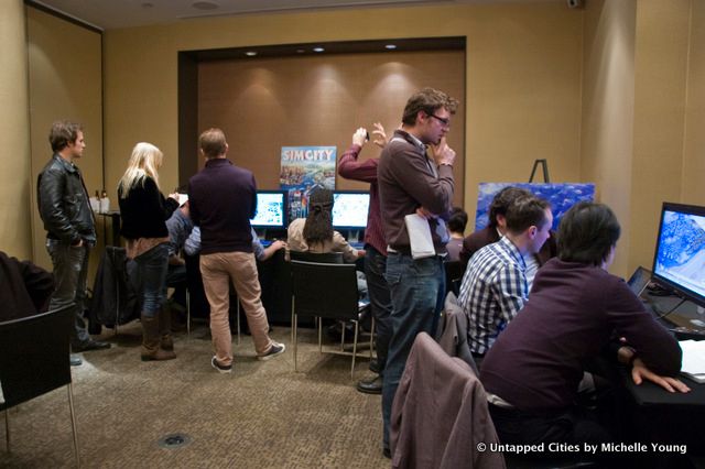 On assignment as the architecture columnist for Kill Screen, a video game and culture magazine, we attended the preview of the new SimCity at the W Hotel Times Square last month. When we arrived, a full-on urban planning competition, run by Fast Company’s Co.Exist, was going down between some impressive teams: Architecture firm KPF (currently designing Hudson Yards and many international projects), non-profit open source tech company OpenPlans, Columbia University’s Studio-X NYC team led by BldgBlog‘s Geoff Manaugh, MIT Department of Urban Studies and Planning, and Gang Studio Architects. The latter two teams were playing remotely from MIT and Chicago respectively. On hand was also the team from EA, including SimCity designer Stone Librande.