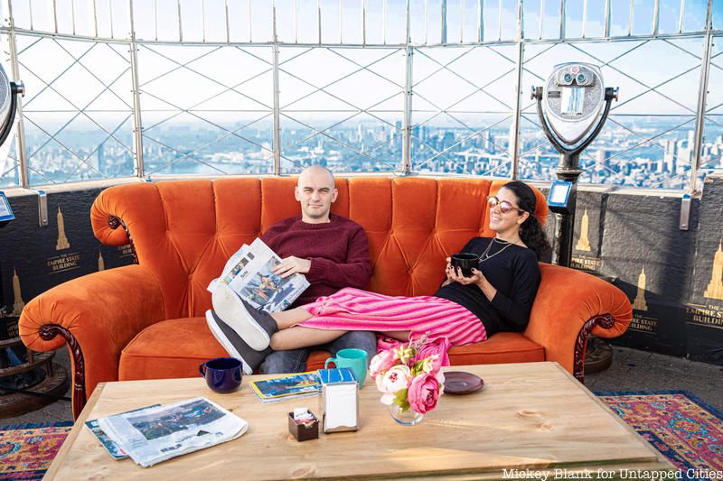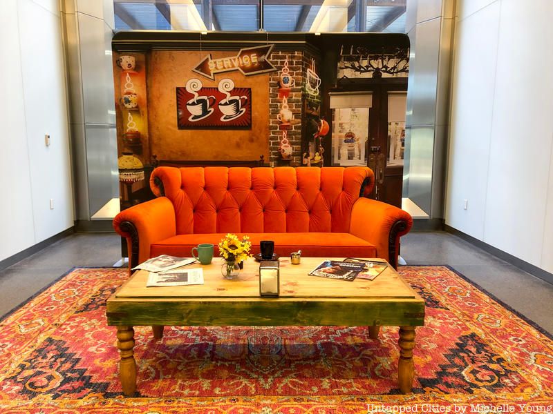 It’s the 25th anniversary of the television sitcom, Friends and Warner Bros. has put replicas of the famous orange couch all around the world. In addition to the sold-out Friends pop-up exhibit in Soho, this weekend only you can sit on it atop the Empire State Building observation deck on the 86th floor (with wooden coffee table, coffee mugs, newspapers and magazines too). Our Untapped Cities Insider, Mickey Blank, who runs New York Live with Mickey, shared with us her photographs of her experience on the Friends couch earlier today. The Friends couch is also in the Warner Media offices, down the elevator bank which we photographed yesterday.