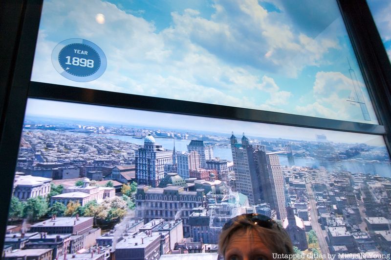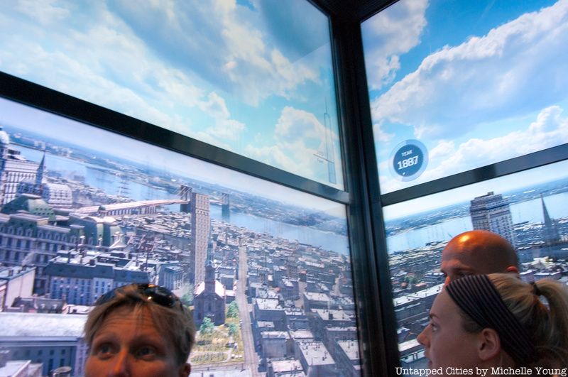 The date of the original World Trade Center opening is correct, and you see the elevator become wrapped in the recognizable pattern of the original Twin Towers in 1971, and fast forwarding to 2006 is the completion of 7 WTC. In about 2010, the beams of the new 1 WTC enter the frame until you arrive to the 102nd floor deck.