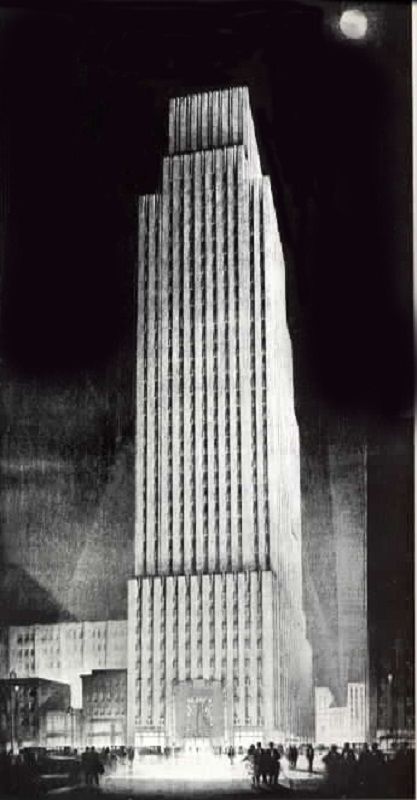 “New York Daily News Building” (1930) by Hugh Ferriss. Via Wikimedia Commons from Dover Publishing.