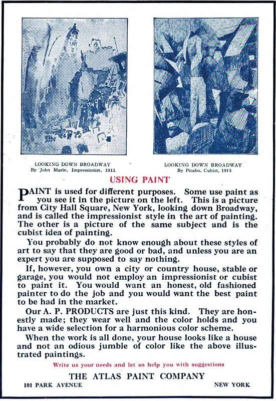 Marin’s skyscraper work was even displayed in advertisements for building paints, though his work was dismissively referred to as “an odious jumble of color.”