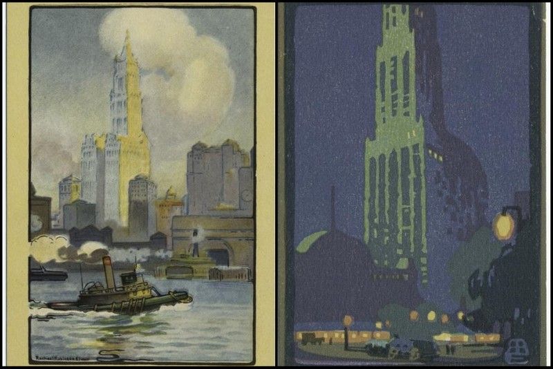 Two images of the Woolworth Building (left, 1914; right 1916) by Rachael Robinson Elmer