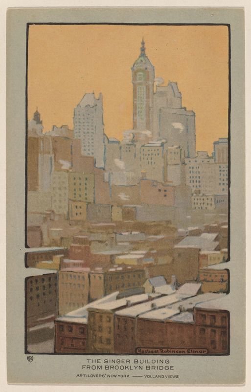 “The Singer Building from Brooklyn Bridge” (1914) by Rachael Robinson Elmer. Via NY Public Library Digital Collections