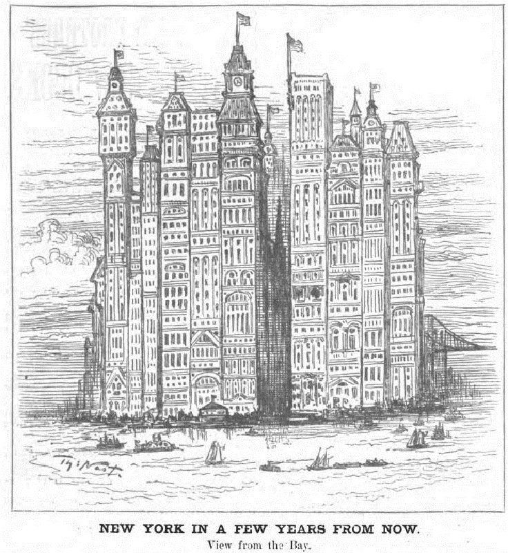 In 1881 political cartoonist Thomas Nast (1840-1902) drew “New York In A Few Years From Now: A View From the Bay” for Harper’s Weekly. It was a prescient view of a future Lower Manhattan, teeming with tall, slender towers. It is unclear if Nast, a German immigrant known for his sharp edged opinions and his crusade against Boss Tweed, intended this image as a future to be weary of or one to be embraced.