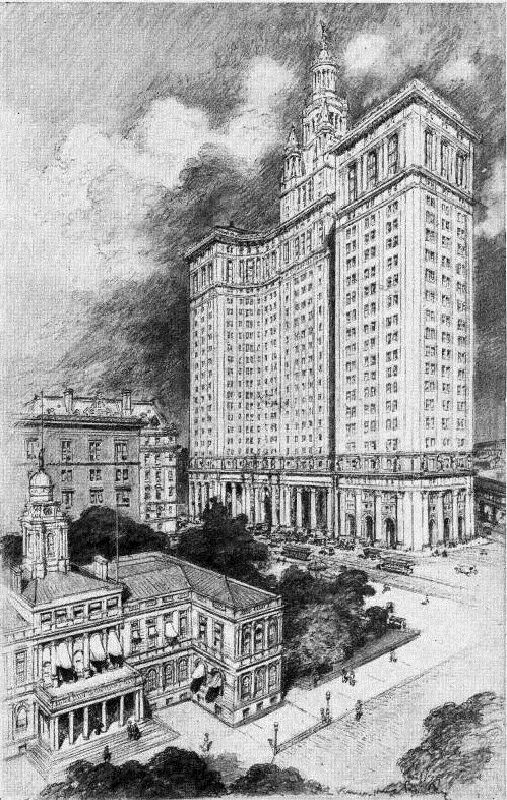 His drawings shown here are of the Metropolitan Life Tower at Madison Square Park under construction, with the second Madison Square Garden in the background, and a rendering of the Municipal Building in Lower Manhattan and nearby City Hall, showing the contrast between early nineteenth and early twentieth century civic architecture.