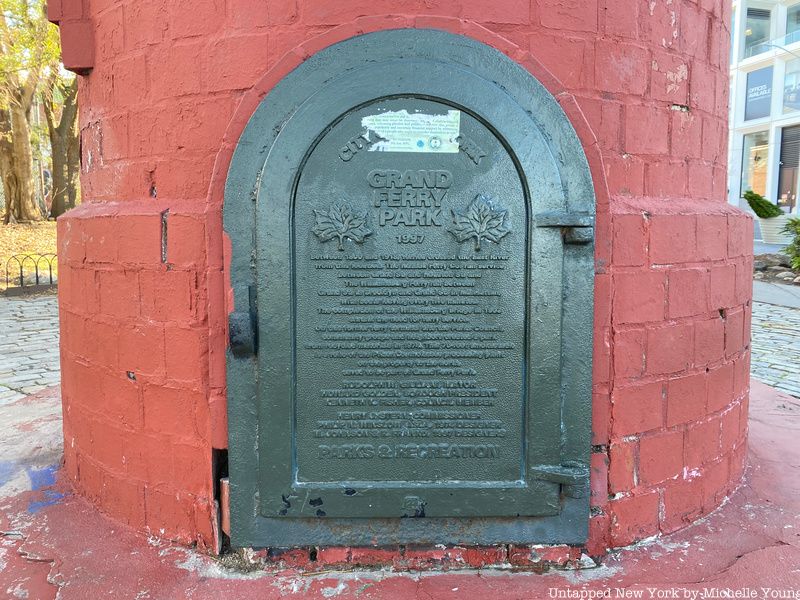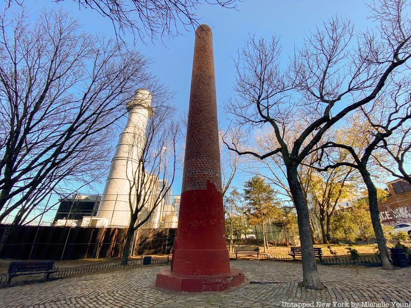To facilitate this fermentation process, Pfizer opened a molasses processing plant on the Brooklyn waterfront in the early 20th-century. The only piece left of the plant is a 20-foot-tall smokestack. The Pfizer smokestack was preserved and is now a fixture of Grand Ferry Park on River Street and Grand Street. The plant was down the road from another one of Brooklyn’s industrial giants, the Domino Sugar Factory, now Domino Park. This molasses processing plant was located just over two miles from Pfizer’s main manufacturing hub on Flushing Avenue. Grand Ferry Park is named for the 19th-century Grand Street Ferry, which used to carry farm goods and passengers from Brooklyn across the East River to Manhattan. The cobblestones arranged in a circular pattern around the base of the Pfizer smokestack were salvaged from the section of Grand Street where the park was constructed.