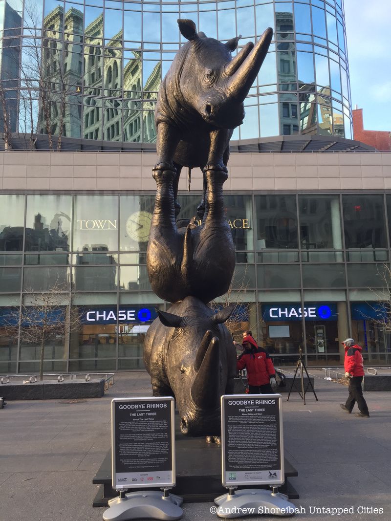 I run across Astro Place almost everyday as I try to catch the 6 train to work, todays encounter had three unexpected visitors. #TheLastThree #AstroPlace #RhinoSculpture https://t.co/MeKLY3KIPx pic.twitter.com/Opk3Lilk4D