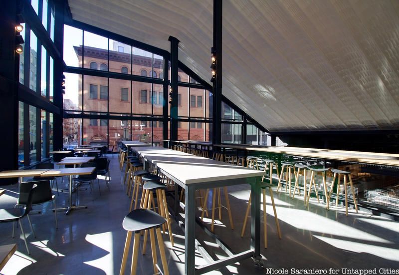 In addition to the ground level vendors, the new space will feature a large gathering area on the mezzanine level. The floor to ceiling windowed space has seating for over 100 people and unobstructed views of the market activity below and streets scenes. Directly adjacent to the seating area is a state-of-the-art demonstration kitchen that will hosts community programming centered around food and nutrition. French doors connect it to the rest of the gathering space.