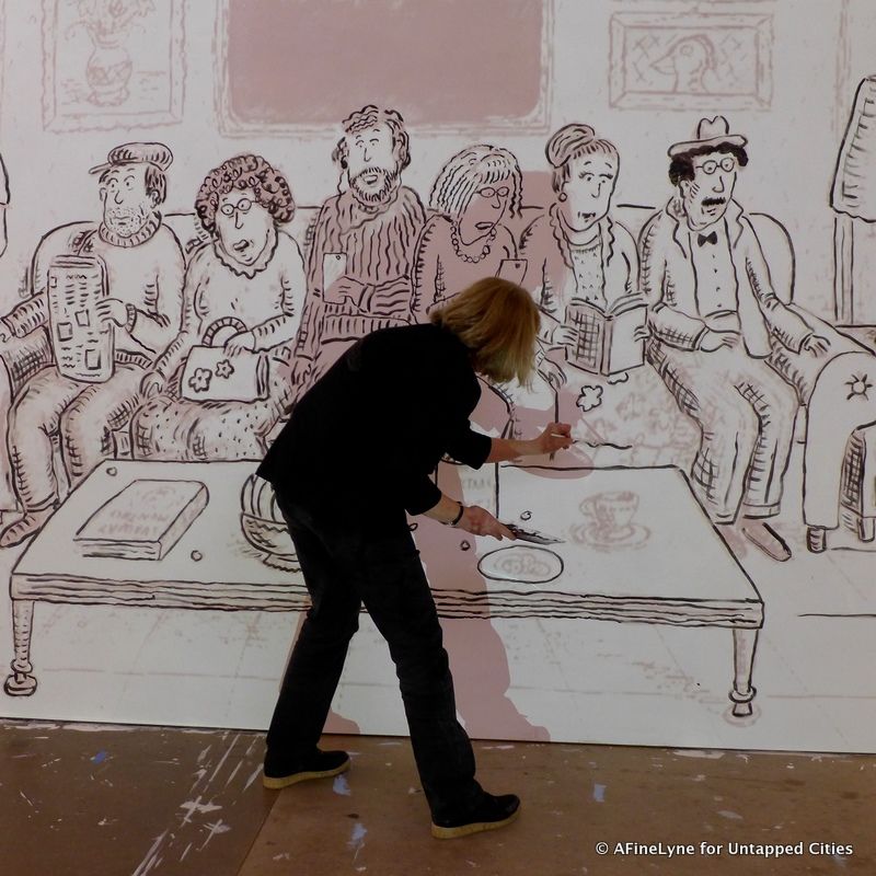 Cartoonist, Roz Chast working on a piece that will hang at the entrance to her exhibit