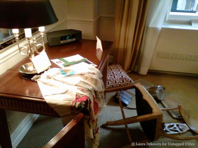 At first glance, Sophie Calle’s installation art exhibit “Room,” at the Lowell Hotel seemed like a very precisely curated collection of everyday objects. Her room, Room 3A, which runs at $185o per night, was a classically decorated hotel suite full of things like clothes (both men’s and women’s), bags (including one of those canvas totes from The Strand), orchids, books, handwritten letters, a model Eiffel Tower, a typewriter, and a wedding cake, among other things. However, Calle collects more than just objects, she collects stories.