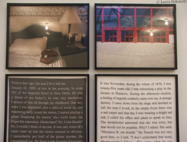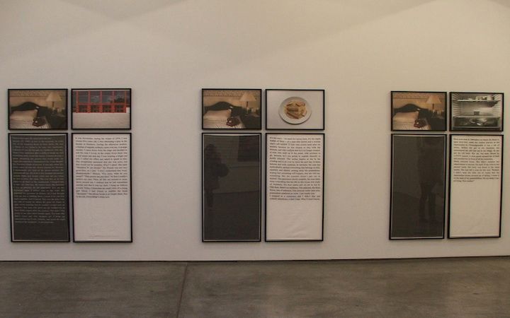 The work on display at Paula Cooper Gallery is from Exquisite Pain (2003). As I walked into the gallery and saw the three diptychs in front of me, I realized that I had seen this exhibit before. It was featured in Elles at the Centre Pompidou in Paris. There are actually nine diptychs, though only three are displayed at Paula Cooper. The idea behind Exquisite Pain stems from an act of catharsis. After suffering a painful breakup, Calle asked friends and chance encounters to describe their most painful moment. Each person’s story is embroidered on a white linen panel on the right under a photograph that represents an aspect of their memory. These are coupled with Calle’s story embroidered on the left. The photo of the red phone on the hotel bed remains the same, but as you move through the exhibition, you see that Calle’s story becomes shorter and shorter until it disappears completely, representing the end of her pain.