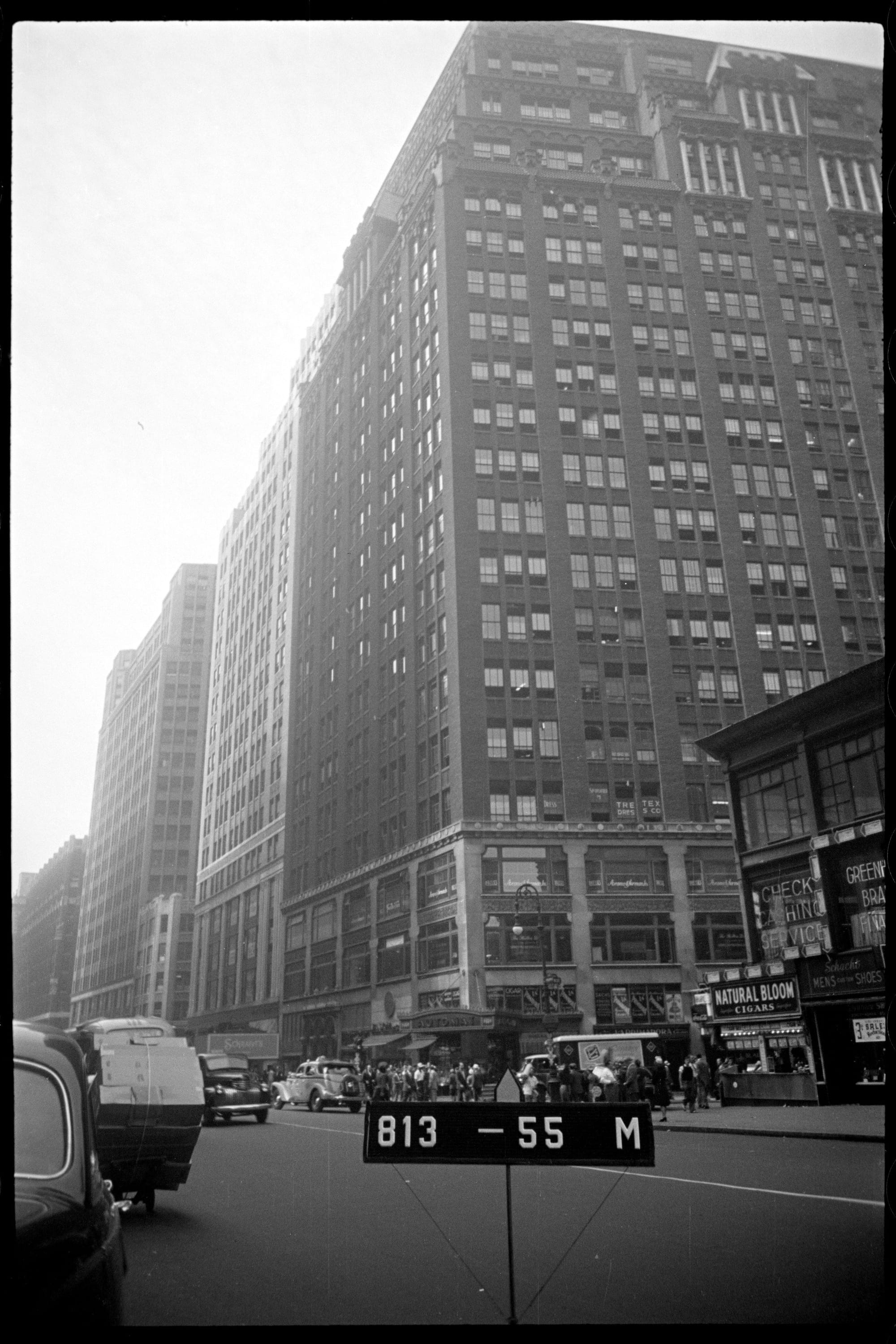 Towering over a parking garage at the center of the block between Broadway and Seventh Avenue, the sign directs hungry passersby to a Horn & Hardart Automat Cafeteria, "on Broadway corner in this building." That building at 1385 Broadway, also known as the Bricken Broadway Building, is an Art Deco office tower built in 1926.