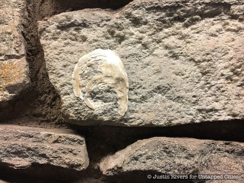 Untapped Cities tour guide, Justin Rivers, shared this photo of the wall, seen with fossilized oyster shells