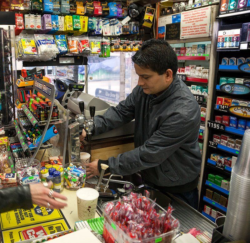 It’s also “all in the way you stir it,” Ray Patel told us when interviewing him for our book, Store Front: The Disappearing Face of New York. Because most of the original soda fountain locations have closed, true egg creams are rapidly disappearing. To this day, Gem Spa continues to make their egg creams using the same recipe and original soda fountain machine from the 1940s. The countermen learned to make egg creams from the previous owner who learned from the previous owner before him. The chocolate, vanilla, and coffee-flavored syrups were once made in the basement by the store’s original owner but Gem Spa now uses the famous Brooklyn-made Fox’s U-Bet flavored syrups. On a typical weekend night, Gem Spa sells about 70 egg creams.