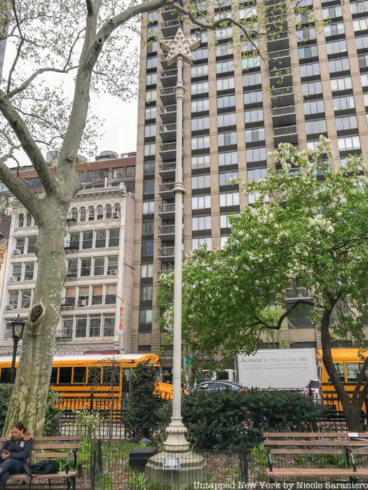 The Star of Hope sits atop a decorative 30-foot cast-iron pole inside the park at 23rd Street between Fifth and Madison Avenues in a spot approximate to where the very first tree stood. Installed in 1916 to commemorate the first Christmas tree lighting, the star actually used to be taken off of the pole and placed atop the annual tree according to a New York Times article from 1940. The five-pointed star shined bright with twenty-two bulbs.