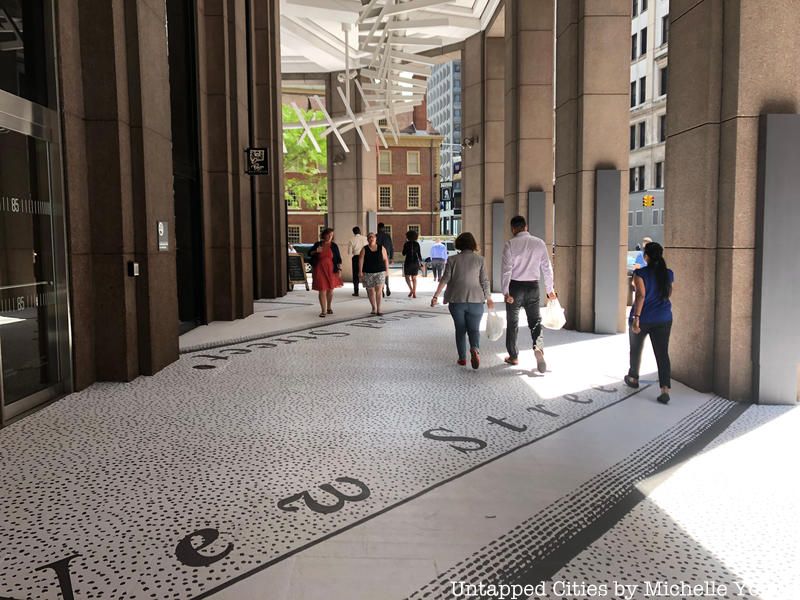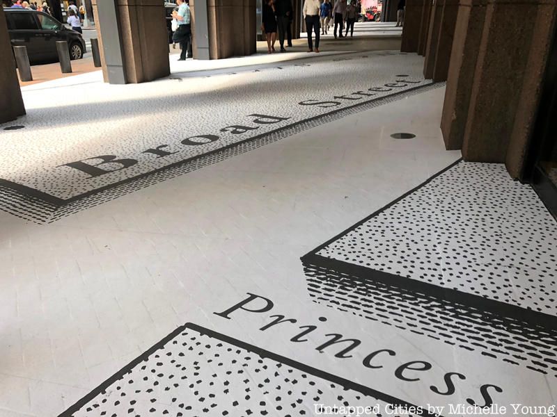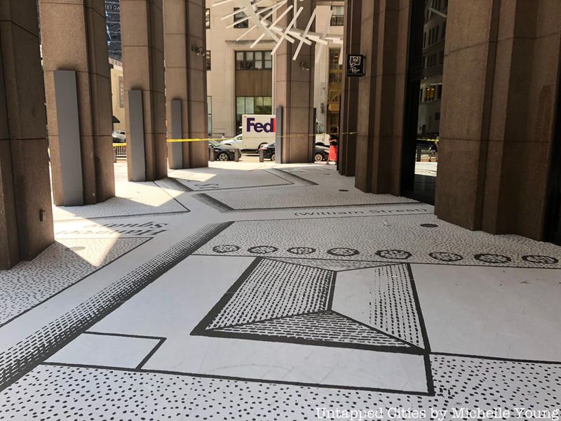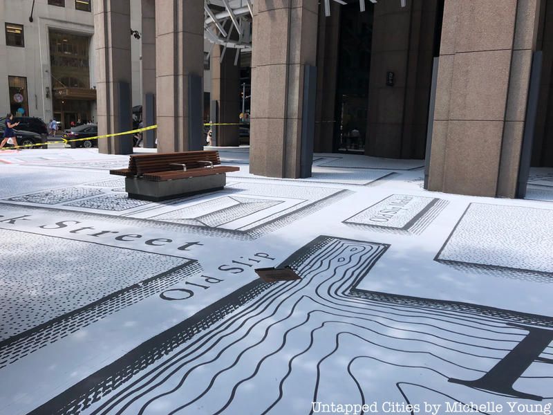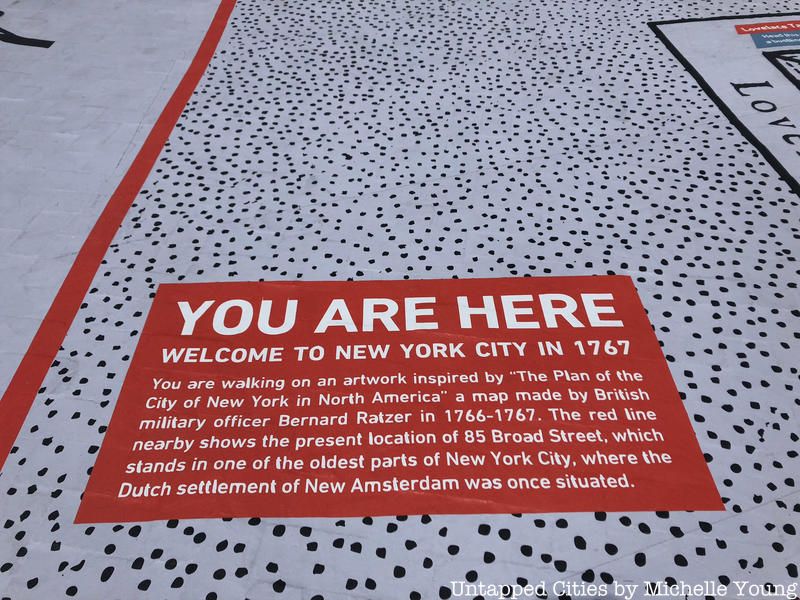 At 85 Broad Street, a building full of historical secrets if you know where to look, is in the midst of installing an impressive piece of artwork on the sidewalks encircling the building in Lower Manhattan. It’s inspired by the 1767 map, “The Plan of the City of New York in North America” made by British military officer Bernard Ratzer from 1766 to 1767. Under this map, our readers may recall, there’s a yellow brick outline that marks the walls of Stadt Huys, the original city hall, one of many signs of Dutch New Amsterdam that still remain.
