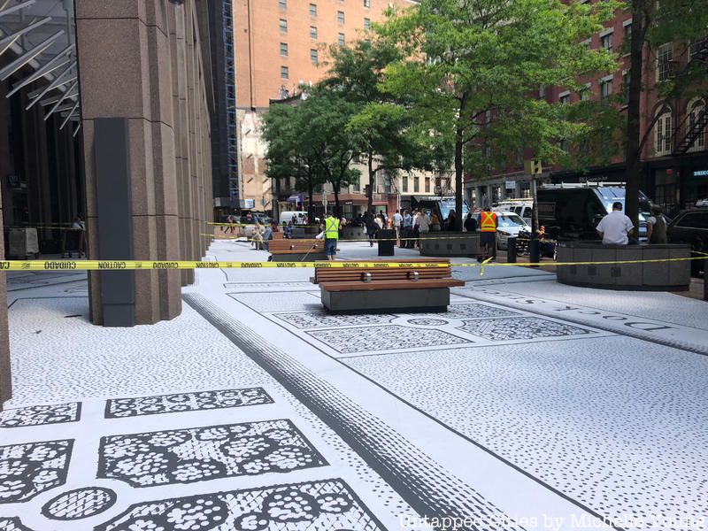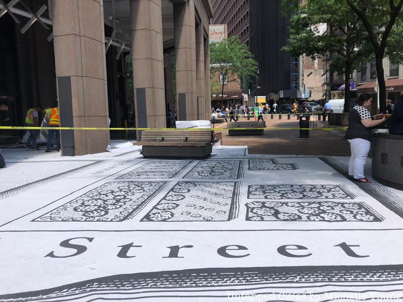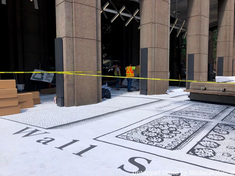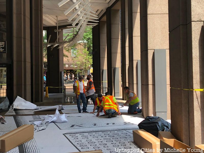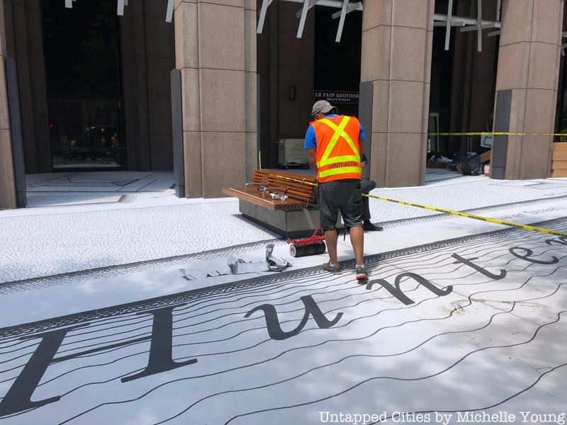 The map, designed by FXCollaborative, made by Jessup Manufacturing Company and printed by National Marker, is made of a foil-backed proprietary material called Asphalt Art, and laid down piece by piece. Each panel measures 4’ x 13’, covering that over 32,000 square feet. On our visit yesterday, almost half of the installation was finished with the total installation taking eight days. Construction workers told us that while the installation is not permanent, it should be up until this fall. Pedestrians of all ages were stopping to read the information, chatting away about history as they walked away.