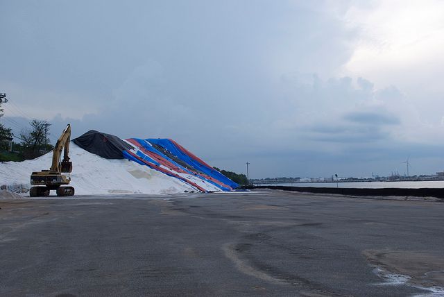 At a brief pause in our audio we were greeted by a stillspotting escort and taken into the Atlantic Salt Company, a run down industrial property, now a depot for road de-icing salt for New York State, New Jersey, and Connecticut. The mounds of salt, leftovers from our uncold winter season, were covered in black tarps with colored weights. The tall brick chimney, no longer in its original use, now looked to be a cell tower.