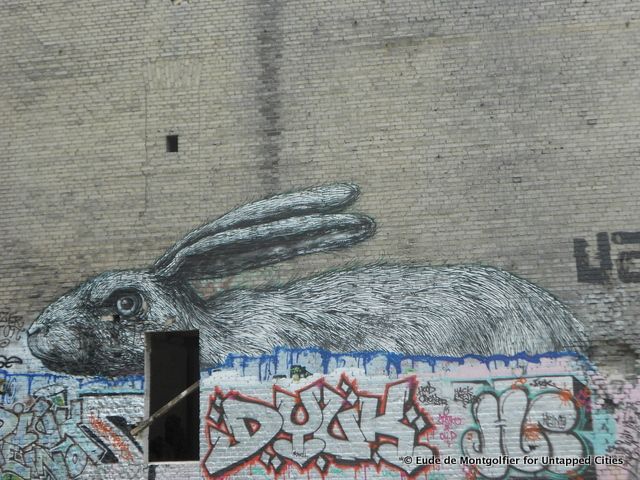 The area has been closed to the public for many years, although it is not private property, as the entrance suggests. The place has served as a film set for famous German movies such as The Tin Drum (1979) and Lili Marleen (1981). It is sometimes made accessible for open air film screenings and other cultural events. Particularly remarkable are the street art masterpieces that surround the place, including its famous rabbit.