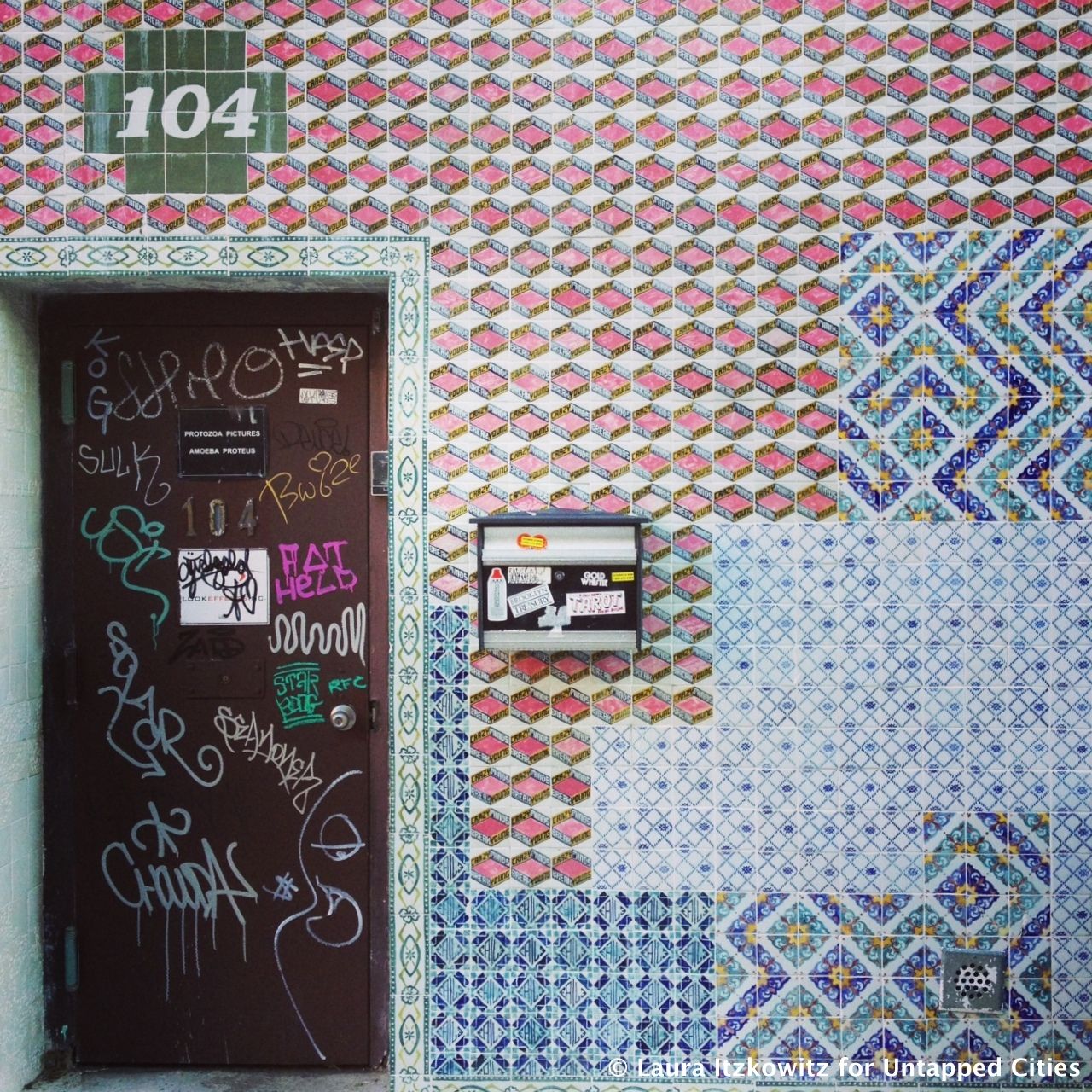 This may not look like our typical Street Art Hotspots, but sometimes you need to look beyond the obvious. Faile, aka Brooklyn-based duo Patrick McNeil and Patrick Miller, created this mosaic mural out of thousands of hand-crafted tiles. The work is aptly titled 104 N. 7th Street based on its location in Williamsburg, just blocks from their studio. Faile is most well known for their comic book style prints and collages that use ephemera from the last one hundred years. Though 104 N. 7th Street departs from their usual bold, graphic style, Faile’s artistic voice can definitely be seen in the collage-like quality of the mural. Here, patterns and color make a bold yet subtle impact. If you look closely, you can see their signature on the tiles.
